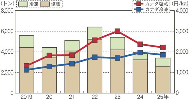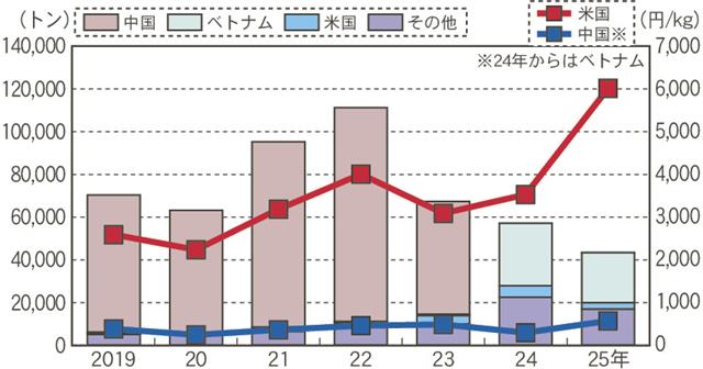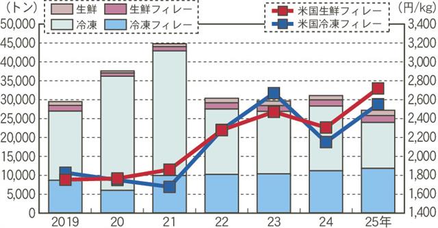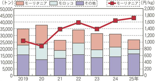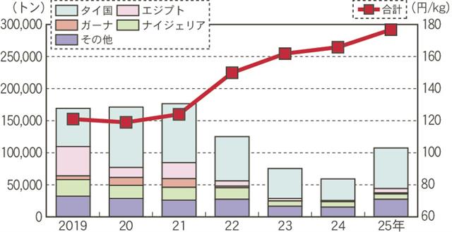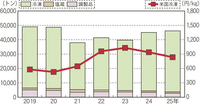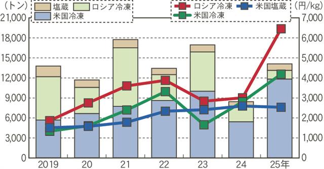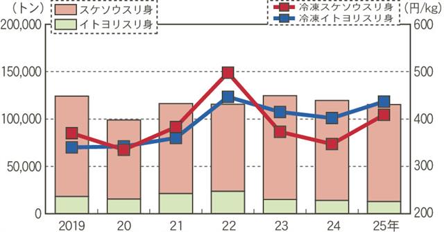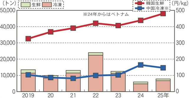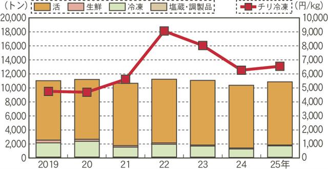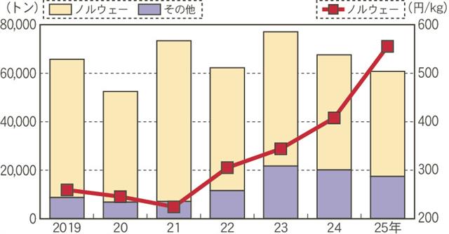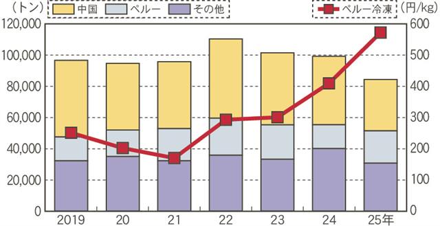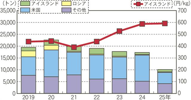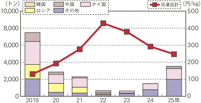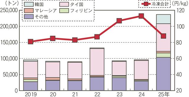 2025年の水産物輸入実績は、最終的に何とか200万トン台を維持する一方、輸入金額は初めて2兆1000億円台に乗せて過去最多を更新した。しかし、このうち魚粉・ミールを除くと実際の可食部に当たる輸入…