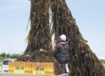 ◎…最盛期を迎えている佐渡島の養殖ワカメは、今年は近年にない大豊作となっている。発育途中での食害がなく、河川からの流入水や低海水温など生育環境も良好なためだ。内海府漁業生産組合の元組合長で、現在は筆頭理事を務める本田裕敏氏は、「水揚げした全量の生ワカメが豊作、良質だったのは数十年ぶりだと思う。毎日、水揚げ作業を行いたいが、作業スペースに余裕がなく、また、量の多さに家族全員が足腰も痛い」と話し、うれしい悲鳴を上げていた。(佐渡)