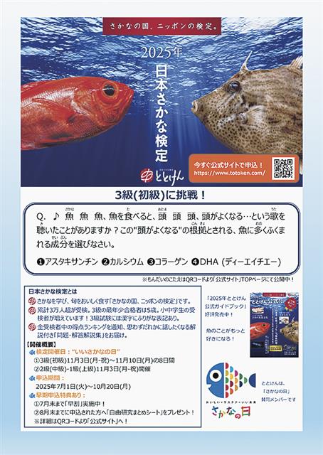 日本さかな検定協会が11月3日にオンライン実施予定の「日本さかな検定(通称・ととけん)」((株)水産経済新聞社など後援)の申し込み締め切りが迫っている。(写真は開催チラシ) クレジット決済は10月…