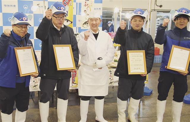 【仙台】水産卸の(株)仙台水産がフグの食文化普及に取り組む新チーム「仙台ふぐおやじ」を結成し、語呂合わせで「ふぐの日」となる9日早朝、仙台市場でお披露目を兼ねたPRイベントを開催した。メンバーは先…