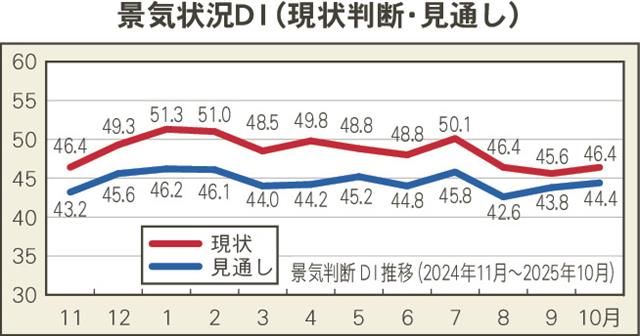 日本スーパーマーケット協会、オール日本スーパーマーケット協会、全国スーパーマーケット協会の流通3団体による景気動向調査2025年10月実績で、景況感を示す景気判断DI(景気動向指数、全企業が「変わ…