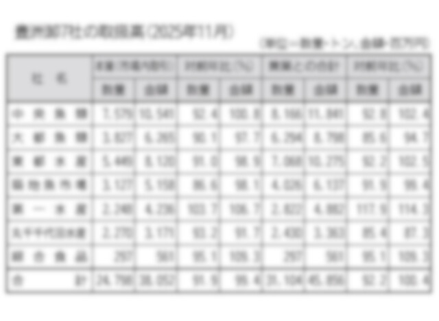 東京・豊洲市場11月の卸会社別取扱高は、前半こそ比較的動きがよかったものの、後半になって売れ行きが業務筋だけでなく、量販店・スーパーのいずれも冷え込む形で失速感が鮮明となり、数量を約8%減らした。…