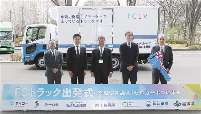 【仙台】宮城県で初めて燃料電池(FC)トラック5台が導入されたことを記念し、仙台市青葉区の県庁舎で5日、出発式が行われた。導入業者には水産卸の(株)仙台水産と関わりのある企業が複数名を連ね、本田誠…