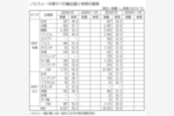 ノルウェー統計局によると、1月の冷凍サバ輸出量は前年同月に比べて64・1%減の8627トンにとどまった。平均単価は70・0%高の50・6NOK(ノルウェークローネ)と、昨年11月以降3か月連続で5…