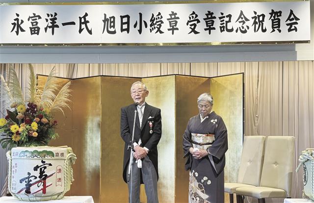 【鳥羽】春の叙勲で旭日小綬章を受章した元JF三重漁連会長の永富洋一氏(JF鳥羽磯部漁協顧問)の受章記念祝賀会が2日、鳥羽市内で開かれた。県内の漁業関係者や行政関係者ら114人が出席し、永富氏の栄誉…