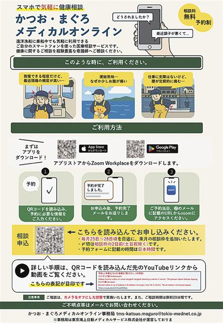 【気仙沼】遠洋漁船の乗組員が気軽、簡単に医療相談できる「かつおまぐろメディカルオンライン」の実証事業が、宮城県北部鰹鮪漁業組合(北かつ、宮城・気仙沼市、勝倉宏明組合長)所属の乗組員を対象に8月1日…