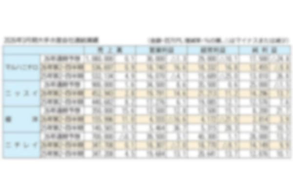 大手水産会社4社の2026年3月期第2・四半期(中間)決算が出揃った。水産関係は北米事業や養殖事業の大幅改善で好調だったものの、食品事業は価格改定効果が出たが減益という厳しい結果となった。水産関係…