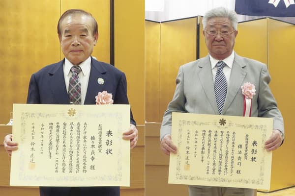 【札幌】北海道主催の北海道産業貢献賞贈呈式が18日、札幌市の京王プラザホテルで開かれた。水産関係では、札幌水産物商業協同組合(札幌市)の佐々木貞幸理事長が商工鉱業功労者(団体役員)、(株)マルデン…