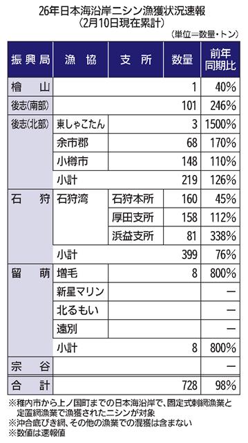 【札幌】北海道水産林務部のまとめによると、道日本海沿岸(檜山-宗谷)のニシン漁の漁獲量は、10日現在で前年同期比2%減の728トンとなった。 1月は好スタートを切ったものの、2月に入ってからシケで…