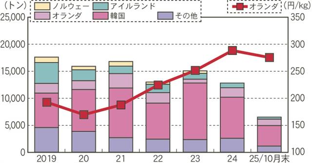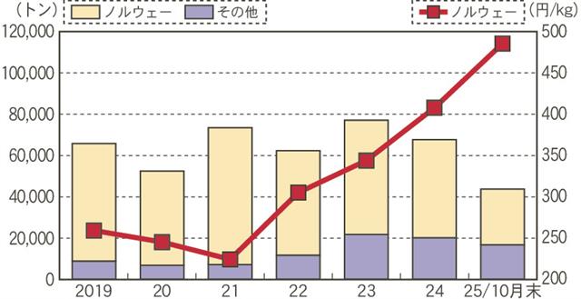 ノルウェー統計局によると、2025年の冷凍サバ一キロ当たりの年間輸出平均単価は、前年同期比50・9%高の39・1NOK(ノルウェークローネ)と24年に付けた過去最高値を大幅に更新した。依然としてア…