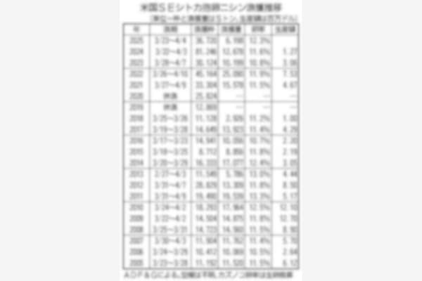 米国アラスカ漁業狩猟局(ADF&G)は現地19日、来春のサウスイースタン(SE)シトカ地区の抱卵ニシン漁について、漁獲ガイドラインを前年並みの3万5015トン(S=ショートトン)とすると発表した。…