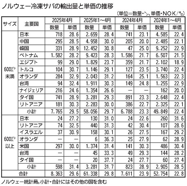 ノルウェー統計局によると、4月の冷凍サバ輸出量は、前年同月に比べて9・9%多い8363トンだった。月後半にかけて若干の水揚げがあったが、原料が逼(ひっ)迫するアジア市場の強い引き合いを満たす水準に…