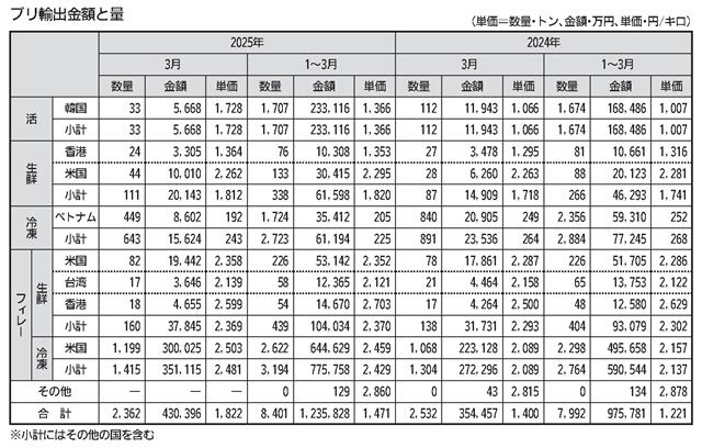 財務省がこのほど発表した4月のブリ類の輸出量は前年同月比3・1%増の2784トン、金額では20・6%増の47億9463万円だった。米国の「相互関税」が発表された直後で、課税が実行される前に輸出を模…