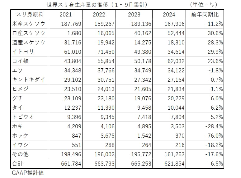アラスカスケソウダラ生産者協会(GAAP)がこのほど発表した、2024年第3・四半期まで(1~9月)の世界スリ身生産量(推定値)は、前年同期比6・5%減の62万1854トンだった。コイ類やロシア産…
