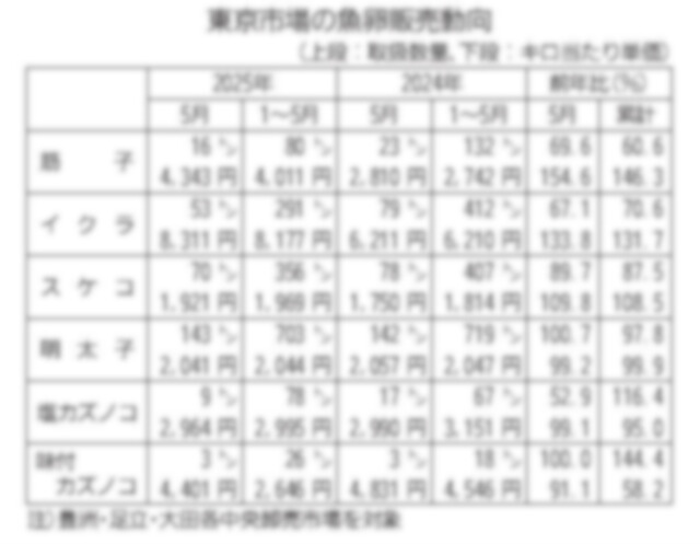 東京都中央卸売市場5月の塩蔵魚卵販売は、依然として集荷に乏しい鮭卵類が高値に張り付いているほか、スケコ類は明太子が前年並みを維持している半面、値上がりしたスケコは減少し、カズノコ類はまちまちとなっ…