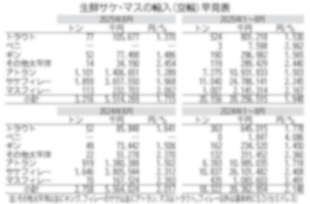 財務省の輸入通関統計によると、空輸による8月のサケ・マス買い付けは主力商材の頭付き(H&Gヘッドオン)とフィレーがノルウェー産中心に復調を強め、頭付きは20か月ぶりに1000トンを超えたほか、サケ…