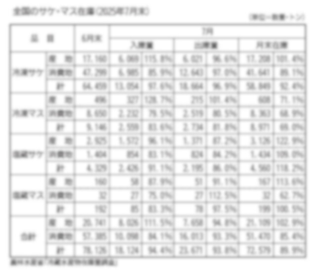 7月末のサケ・マス在庫は引き続き減少し、チリギンの高値に結び付いた3年前に準ずる低水準で推移している。秋サケの不漁などで、今後ますます在庫は低下していく見通しだ。 7月末の全国在庫は7万2579ト…
