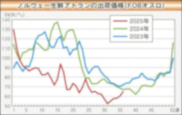 ノルウェー生鮮アトランティックサーモンの池出し価格は続伸し、9月に入って前年同期まであと一歩に近づいた。7月末の最安値だったキロ50NOK(ノルウェークローネ=11日、15・16円)強からの市況回…