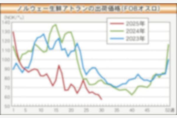 ノルウェー生鮮アトランティックサーモンの池出し価格は7月中旬から下げ足を速め、8月入りとなった第31週のサイズ込み平均価格はキロ50NOK(ノルウェークローネ=7日、14・80円)台前半まで急落し…