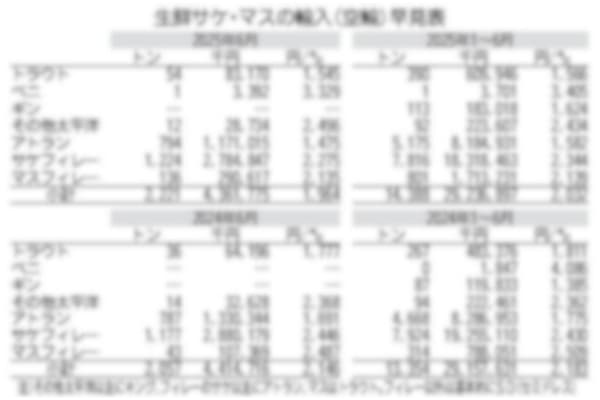 財務省の輸入通関統計によると、空輸による6月の生鮮サケ・マス買い付けは引き続き前年を上回ったが、調達単価の値下がりで輸入金額は3か月ぶりに前年同月を下回った。主力のアトラン製品の値下がりが続いてい…