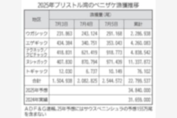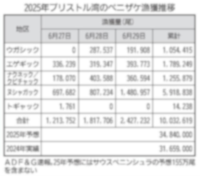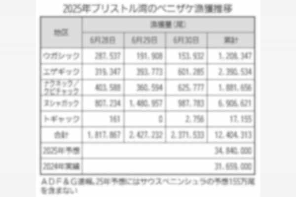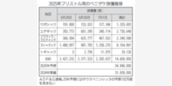 ブリストル湾のベニザケ漁は例年より早く盛漁期入りしたとみられ、現地6月30日までの漁獲はすでに1200万尾を超えた。 (別表参照) 米国アラスカ漁業狩猟局(ADF&G)によると、30日の漁獲量はお…