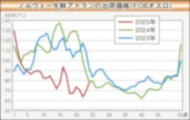ノルウェー生鮮アトランティックサーモンの池出し価格は続伸し、急落中だった前年同期とほぼ同水準になった。順調な成長・生産・出荷によって近年の価格推移と全く異なる価格推移をうかがわせている今年は、例年…