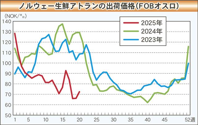 ノルウェー生鮮アトランティックサーモンの池出し価格は引き続き反発力に乏しく、潤沢な出荷を背景に再び反落した。ただ、復活祭(イースター)明けは大きな値動きは影を潜め、平均池出し価格はキロ70NOK(…
