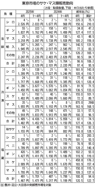 東京都中央卸売市場4月のサケ・マス販売は、新高値を記録した冷凍ギンの扱いが前月同様急減し、冷凍全体の大幅減少が続いた。生鮮はわずかに前年を下回り、塩蔵は高値でも前年並みを維持した。(別表参照) 【…