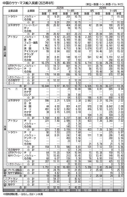 中国税関総署の統計によると、中国が4月に輸入したサケ・マス製品は生鮮が加速し、アトランティックサーモンだけで再び1万トンを超えた。冷凍物の不振で全体では前年並みにとどまったが、生鮮搬入の勢いが止ま…