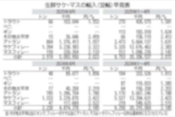 財務省の輸入通関統計によると、4月の空輸によるサケ・マス搬入はフィレー製品の盛り返しなどで再び前年同月を上回った。頭付き(H&Gヘッドオン)製品とともに調達単価の値下がりが進んでいる。(各種別表参…