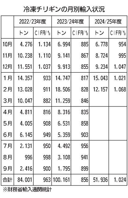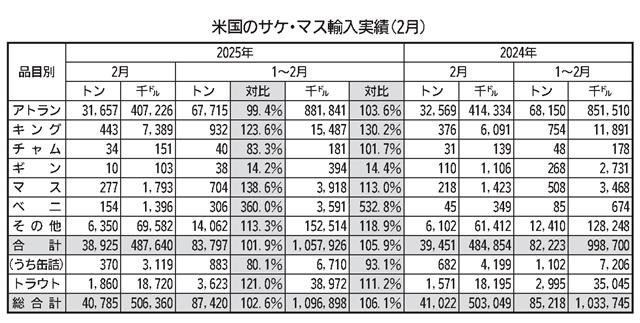 財務省の通関統計によると、2月のサケ・マス全体の輸入実績は2万2137トン、300億3938万円で、前年の同じ月に比べて数量で25・5%、金額で8・1%ともに大きく減少した。1月の増加から暗転し、…