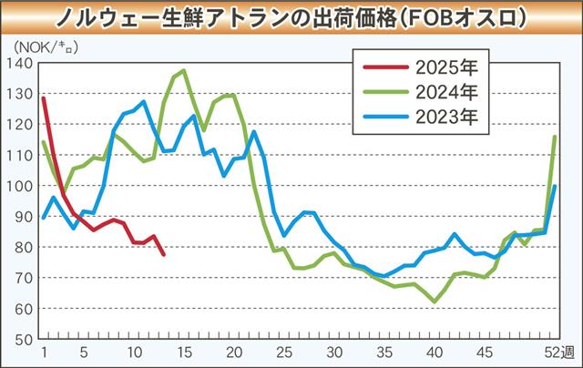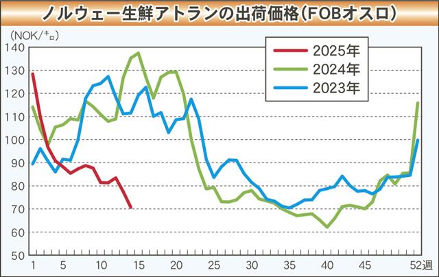 ノルウェー生鮮アトランティックサーモンの池出し価格は引き続き低迷しており、4月に入っても好転どころかさらに引き下がった。生産が順調なうえ需要もそれほど強くはなく、加えて“トランプ関税”が市況の足を…