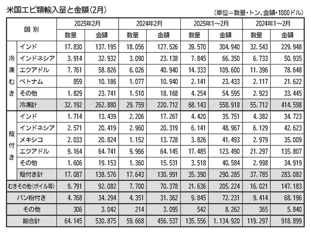 米国海洋漁業局(NMFS)がこのほど発表した2月のエビ類の輸入量は前年比7・5%増の6万4145トン、金額では16・3%増の5億3088万ドルだった。冷凍むきエビは、主力のインドが端境期で搬入は減…