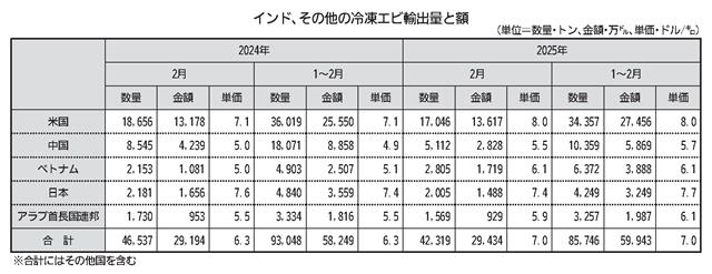 インド商工省がこのほど発表した2月のエビ類の輸出量は前年同期比9%減の4万2319トン、輸出キロ単価は0・7ドル上昇し7ドルを超えた。魚種別では主力の養殖バナメイの輸出量が7・7%減少しただけでな…
