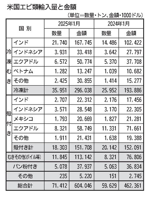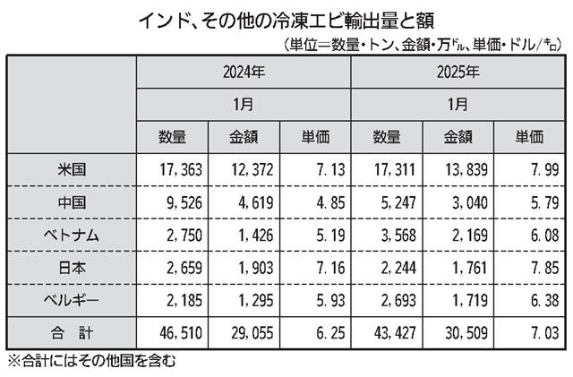 米国向けは前年並み実績 インド商工省がこのほど発表した1月のそのほかの冷凍エビの輸出量は前年同月比6・6%減の4万3427トン、金額では5・0%増の3億509万ドルで単価は上昇した。国別では米国向け…