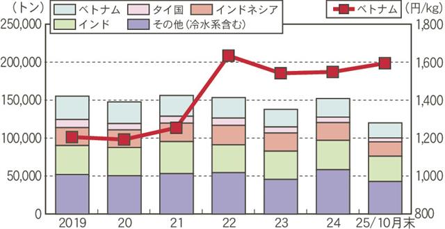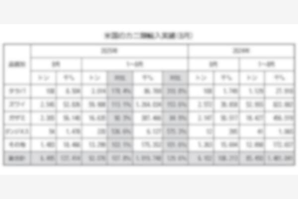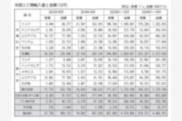 米国海洋漁業局(NMFS)がこのほど発表した10月のエビ類の輸入量は前年同月比22・7%減の5万7758トン、金額では18・0%減の4億9813万ドルだった。8月から本格的に実施されてきた「相互関…