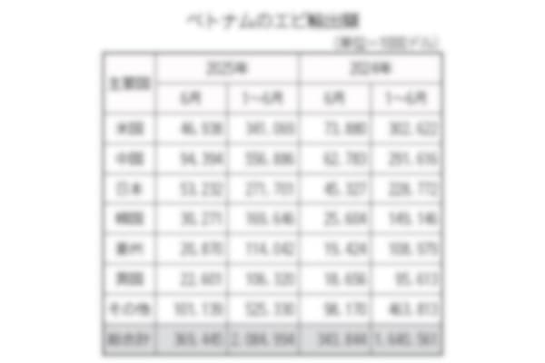 ベトナム水産物生産者輸出者協会(VASEP)はこのほど、6月のエビ類の輸出額を発表した。相場上昇を受けて単月では前年同月比7・5%増の3億6945万ドル。累計では27・1%増の20億8499万ドル…