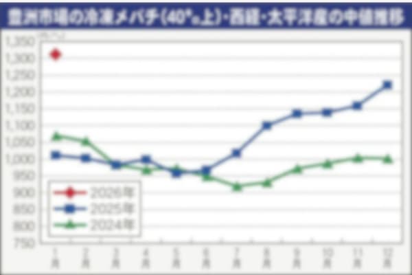 東京・豊洲市場における2025年12月の冷凍大バチ(40キロ上)上場本数は1万213本で、前年同月比で24%減へと激減した。多くの水産商材が高値圏にあり、物価高に伴う購買意欲の減退感が漂う中、コス…