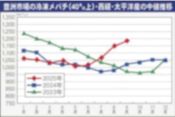 豊洲市場における9月の冷凍大バチ(40キロ上)の上場本数は9687本だった。昨年同月の1万1782本から18%の減少で、2か月連続で1万本を割っている。相場は西経・太平洋銘柄の公表値キロ当たり中値…