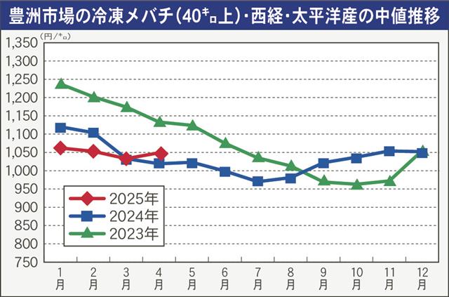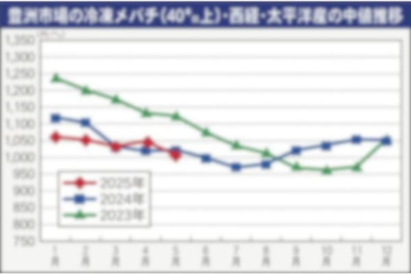 豊洲市場における4月の冷凍大バチ(40キロ上)の上場本数は1万2398本で、前年同月から5%減少した。対して数量が最も多い西経・太平洋銘柄(5786本)の公表値キロ当たり中値は1049円となり、3…