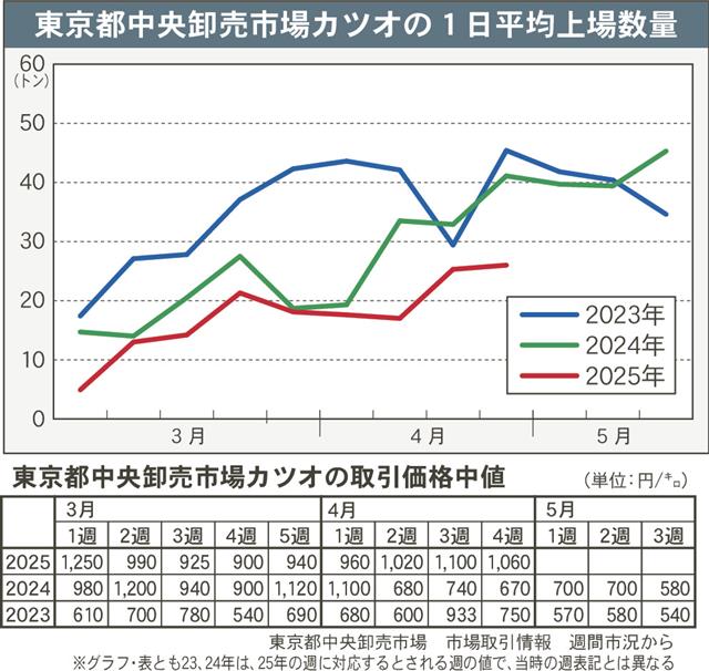 豊洲市場 九州振るわず低調スタート 東京・豊洲市場に入荷する生鮮カツオは3、4月で一度も過去2年の入荷水準を上回る場面なく推移している。南九州の釣果が乏しかったのが大きく影響した。シーズン序盤として…