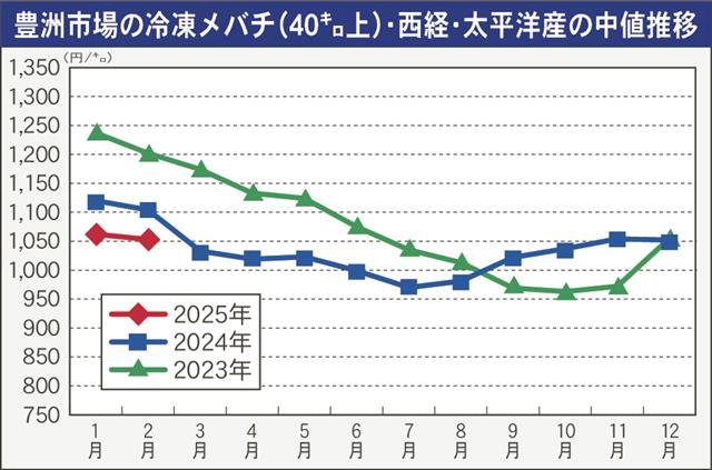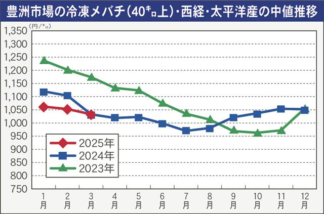 豊洲市場における3月の冷凍大バチ(40キロ上)の上場本数は1万204本で、前年同月から10%減少した。営業日が1日少ないだけでなく、台湾の減船による影響も想定し、無理に上場しない流れがある。ただし…