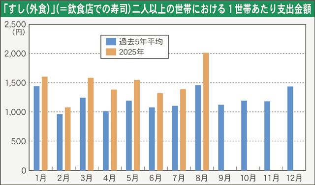 総務省が毎月発表している家計支出(家計調査報告、2人以上の世帯)によると、2025年の「すし(外食)」の品目名で集計されている外食の寿司に対する支出金額は1~8月の累計で一世帯当たり1万1920円…