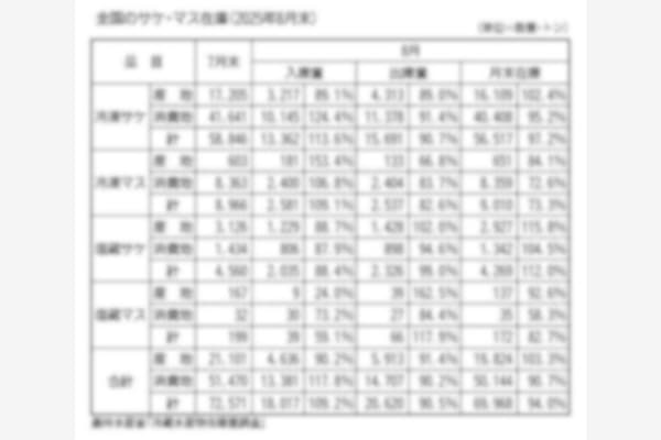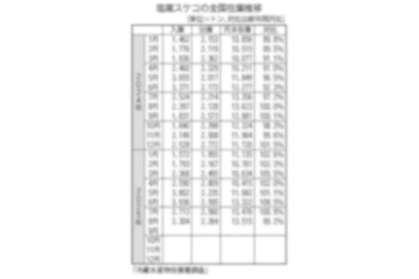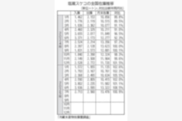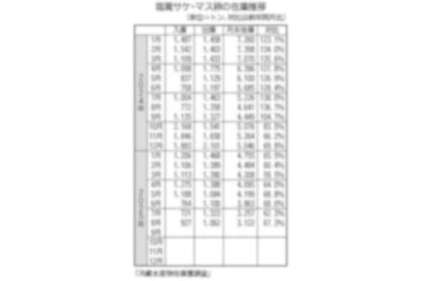 農林水産省の冷蔵水産物在庫量調査によると、8月末の塩蔵サケ・マス卵の全国在庫は引き続き減少したが、出庫の落ち込みが顕著となって、前年同期比での減少率は縮小した。 (別表参照) 8月末の在庫量は31…