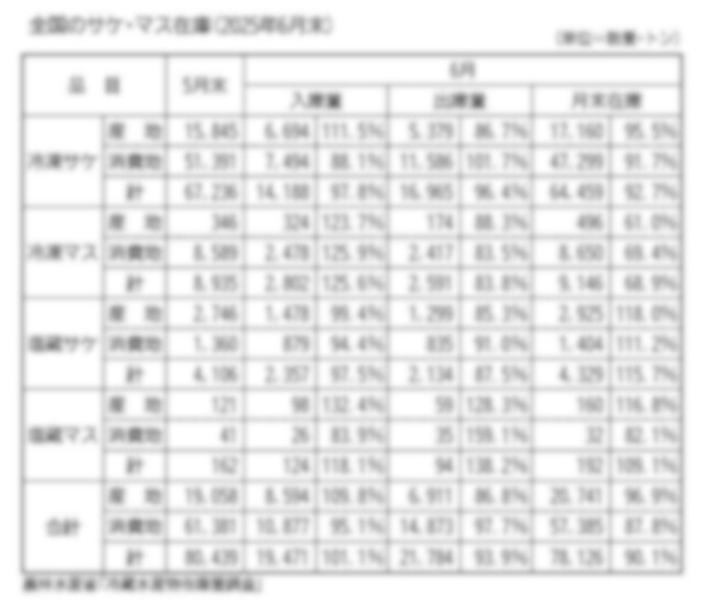 6月末のサケ・マス在庫は、月間出庫量が入庫量を上回ったため5月末より減少し、3年ぶりに8万トンを下回った。 6月末の全国在庫量は7万8126トンで、5月末に比べて2・9%減少し、前年同期との比較で…