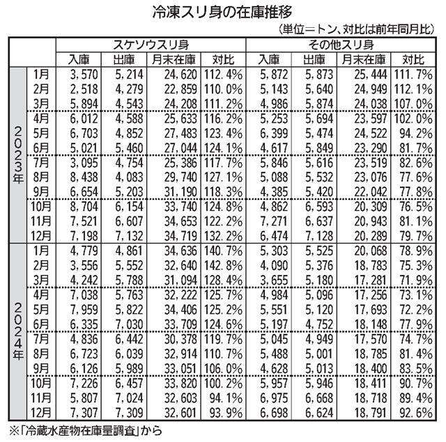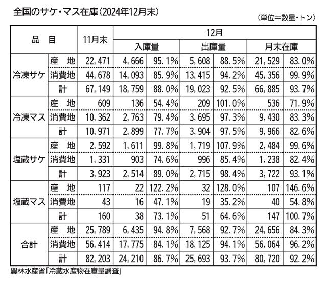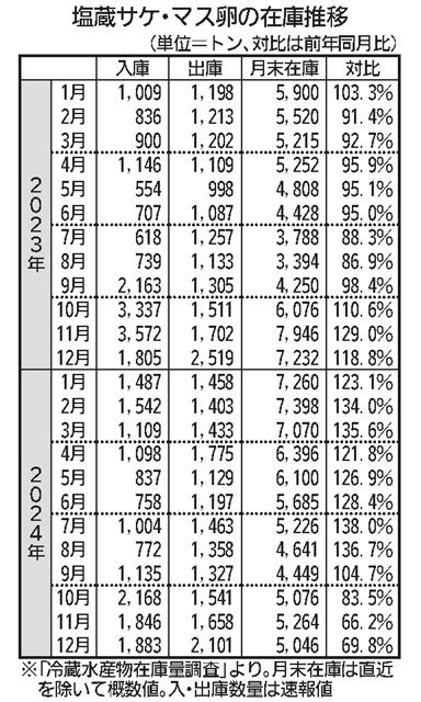 12月末のサケ・マス越年在庫は、入・出庫ともに減少が続き、過去10年で2番目に少ない水準にまで低下した。秋サケの不漁や輸入の減少で製品価格が高騰し、荷動きも鈍化に転じている。 12月末在庫は全体で…