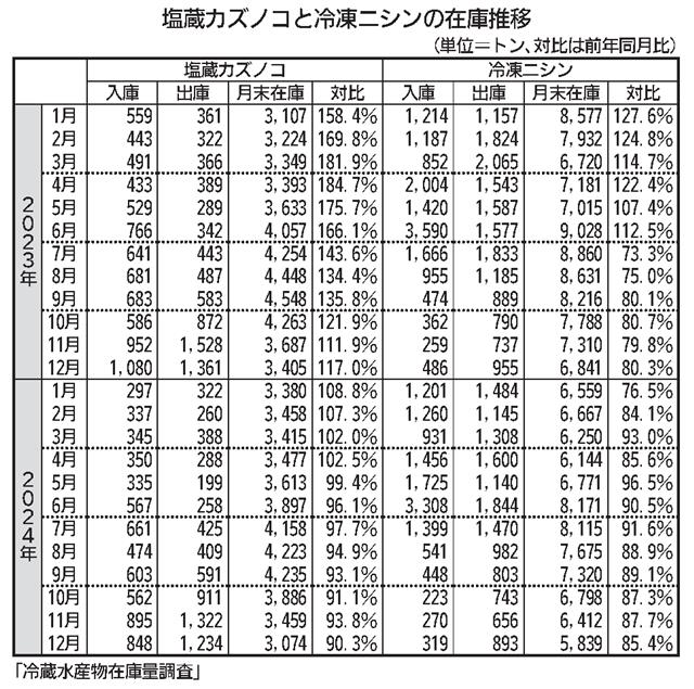農林水産省の冷蔵水産物在庫量調査によると、11月末の塩蔵カズノコと冷凍ニシンの全国在庫は、引き続き減少した。カズノコは前年に比べて入庫が少なかったが、10月に前年を上回っていた出庫は逆に減少に向か…