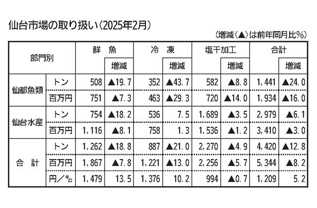 東京都中央卸売市場がこのほど発表した2024年12月の水産物市場別・卸業者別・魚種別取扱高によると、東京3市場合計の水産物取扱数量は3万502トンと前年同月から横ばい、取扱金額は573億8800万…