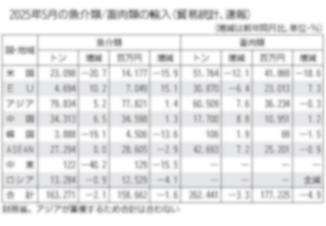 財務省が18日に発表した貿易速報によると、5月の魚介類(非食用水産物を除く)の輸入は、数量・金額ともに3か月ぶりに前年実績を下回った。ただ前年同月がまとまっていた反動が大きく、近年の5月としては比…