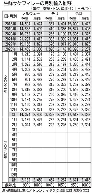 財務省の輸入通関統計によると、2月の空輸によるサケ・マス搬入は単価の下方修正が進んだことで回復基調を強めている。特に主力のノルウェー産アトランティックサーモンの単価は一気にキロ250円以上値下がり…